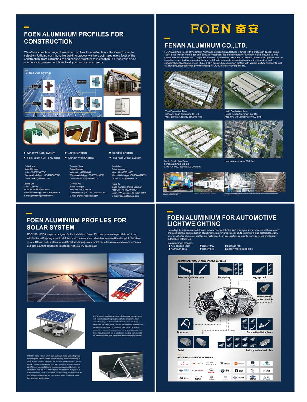 Fenan Aluminum Co., LTD. Is one of Top 5 aluminium extrusion companies in China. Our factories cover an area of 1.33 million square meters with annual output of over 400 thousand tons. We develop and manufacture aluminum extrusions for an extensive range of applications such as:aluminum profiles for windows and doors , aluminum solar frames、brackets and solar accessories,new energy of auto components and parts such as Anti-collision Beam、baggage rack、battery tray、battery box and vehicle frame. Nowadays, we have improved our technical teams and sales teams all over the world,to support the increasing demands from customers.